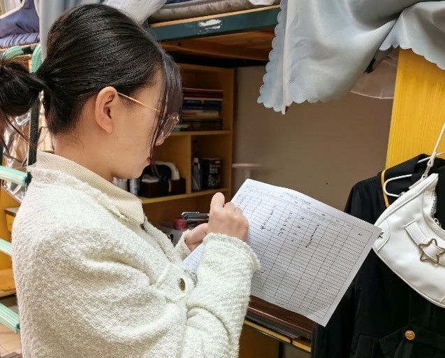 在寝室楼下,老师们与同学们在公寓楼栋值班室进行登记后,正式开始了检查工作。在下寝的过程中,志愿者们谦逊有礼,认真负责地检查每个寝室,老师在旁予以指导并和寝室同学进行交流,提出相关整改建议,强调寝室安全的重要性并宣传了行驶安全,防诈防骗等相关知识。