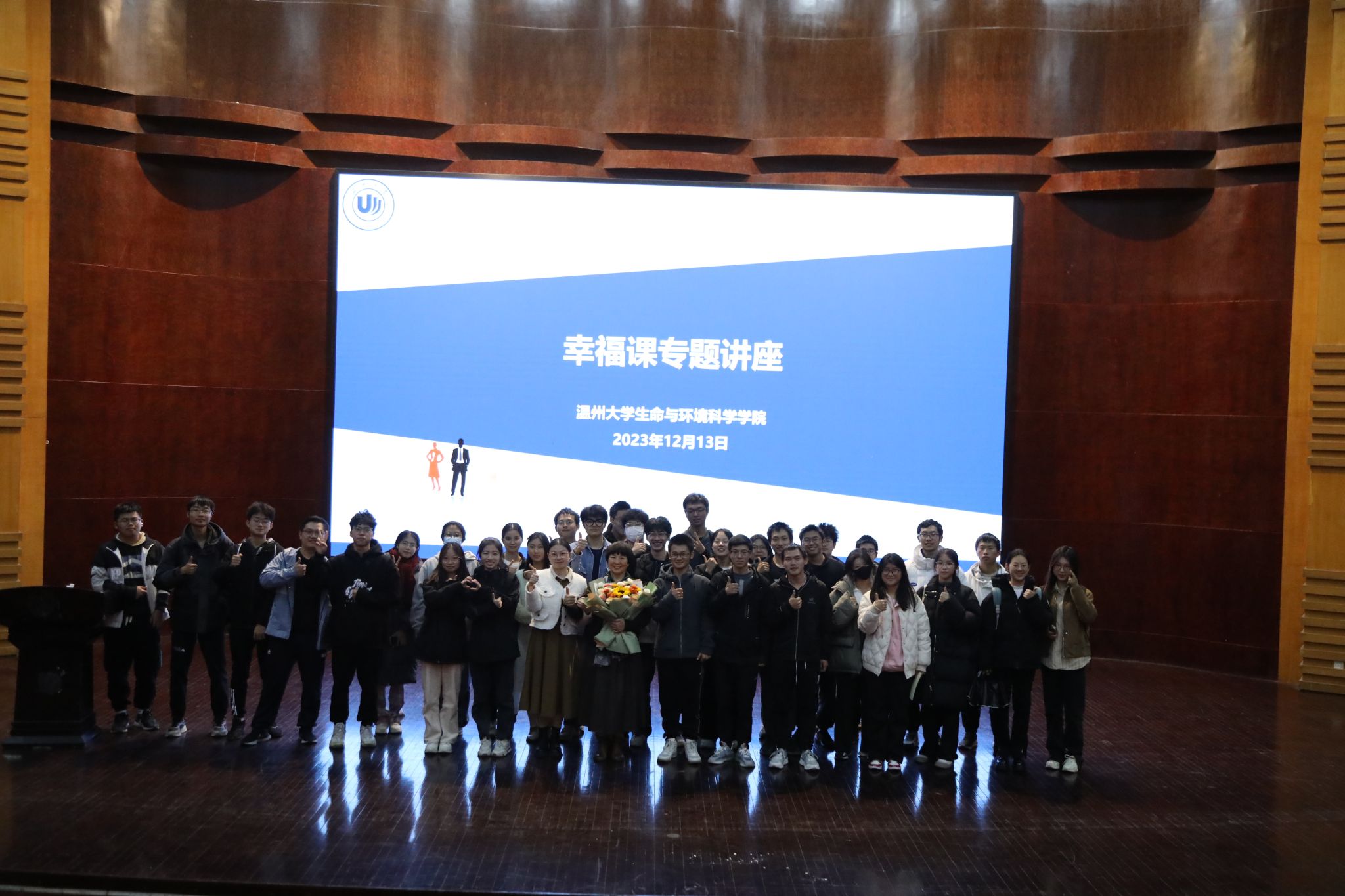 讲座的最后,张亚萍老师给张海音老师献上一束鲜花表达对海音老师的感谢,并对本次讲座进行了总结。她希望同学们都能将本次讲座的内容运用到生活中,活出乐观的自己,做有意义和有价值的事情,并且表达了对同学们衷心的祝愿:“心有一抹暖阳,静待一株花开,愿同学们都能向阳而生,逐光而行!”最后,部分学生以及生活心理部的全体同学上台和两位老师一起合影留念。