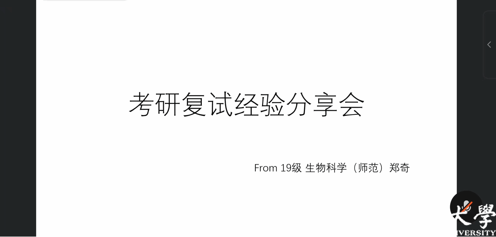李玉宝教授着重对考研英语复试进行了指导,从理解英语复试、个人陈述、面试三方面对本次英语复试做了细致入微的讲解,勉励大家认真准备,努力去做,结果就不会差。19生物科学(师范)1班、现为复旦大学研究生郑奇和19环境工程班、现为桂林理工大学研究生覃桂妹,分别与同学们分享了有关考研复试与考研调剂方面的经验,悉心讲解了考研复试和调剂内容、流程讲解、文献阅读技巧、面试经验、联系导师经验、资料准备渠道,为学弟学妹们铺陈了通向未来的道路。
