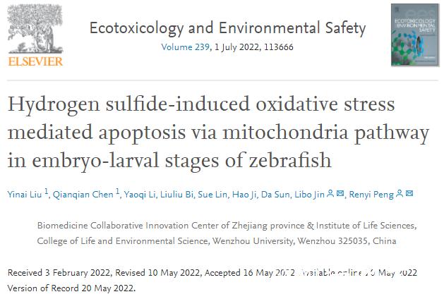近日,温州大学生命科学研究院生物反应器与生物材料课题组在2区杂志《Ecotoxicology and Environmental Safety》(2021 IF: 6.291)上发表了“硫化氢诱导的氧化应激通过线粒体途径介导斑马鱼胚胎-幼鱼阶段的细胞凋亡”的研究性论文。温州大学生命科学研究院金立波博士和彭仁义博士为文章的共同通讯作者,温州大学生命科学研究院刘银爱研究生和陈倩倩研究生为文章的并列第一作者。