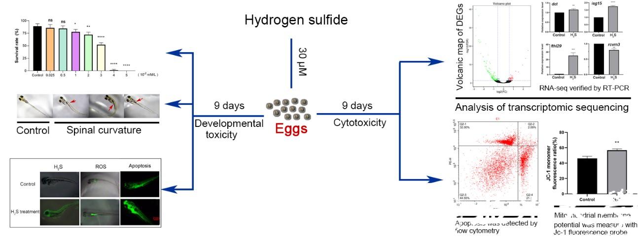 实验方法:本研究将斑马鱼胚胎连续暴露于含有硫化氢的培养液中建立实验模型,对斑马鱼幼体进行了H2S诱导的发育毒性、活性氧积累、抗氧化系统功能、细胞凋亡和线粒体功能的检测。此外,对斑马鱼幼体进行了转录组测序分析并进一步RT-qPCR验证。