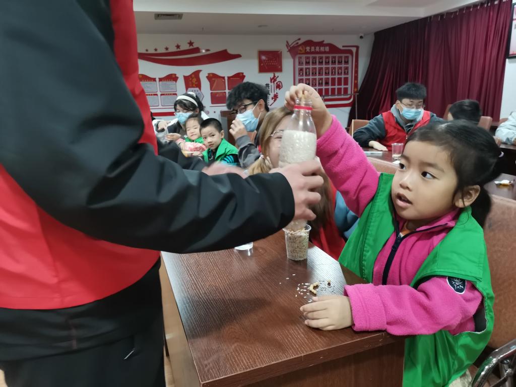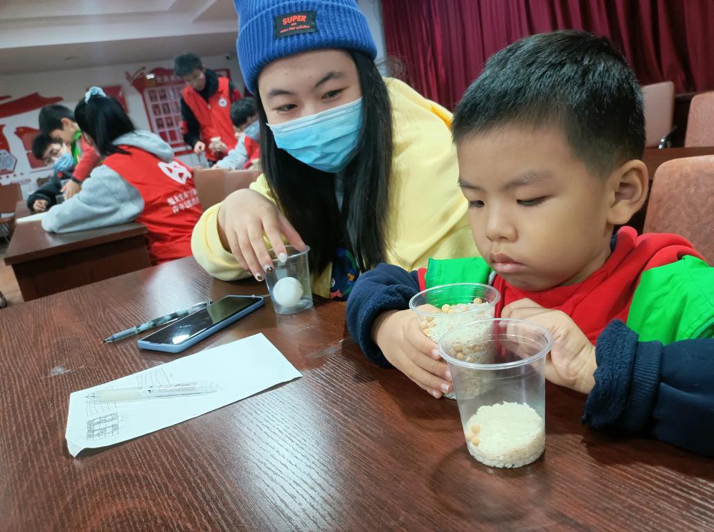 8:50左右志愿者在温州大学南校区东大门集合完毕,穿上红马甲,前往高教博园。9:10志愿者到达高教博园,准备完实验材料后等待小朋友们的到来。9:40左右,活动正式开始。志愿者带领小朋友们初步认识了分子,并引出今天的实验主题“探究分子间隙”,在志愿者和小朋友们共同努力下完成了“黄豆混大米”、“乒乓球的脾气”的实验。在第一个实验中,小朋友们把两杯的黄豆(半杯多)和大米(半杯多)相混合,但是却并没有满出来,而且通过摇匀的方法高度反而降低了更多。在第二个实验中,小朋友们用热水浸泡凹陷的乒乓球,从而让乒乓球复原。通过前面两个实验,小朋友们了解到了“什么是分子间隙”和“热胀冷缩的原理”。在两个实验完成后,志愿者与小朋友们一起参加了“数字炸弹”的游戏。这是一个考验智慧的小游戏,在经历了六轮的角逐之后,诞生了四名获胜者。带领小朋友们放松完后,10:35开始了“大米神力”的实验。小朋友们将筷子插入大米的中央并用手压实,通过向上提起筷子的方式,小朋友们深刻体会到“大米”拥有的力量——“摩擦力”。11:00分活动圆满结束。