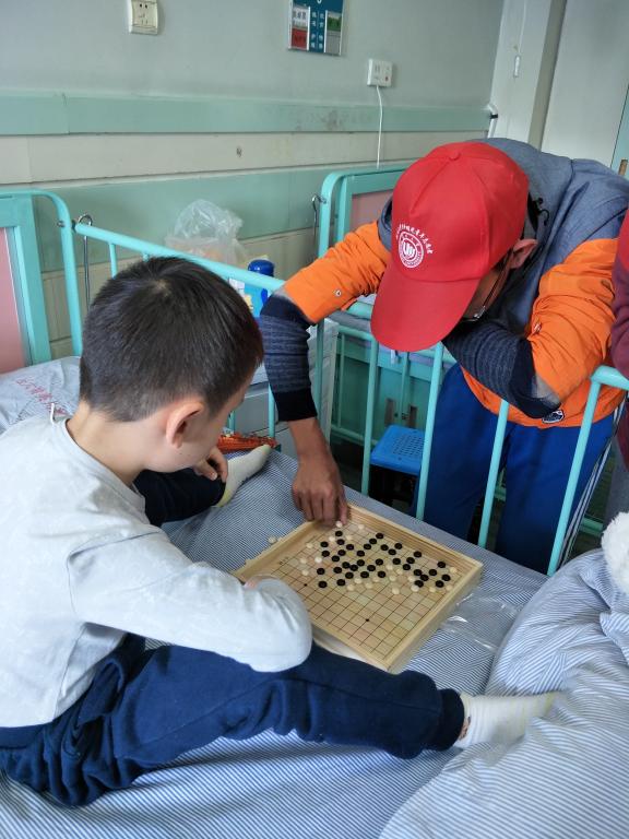 12:50左右,我们的八位志愿者成员到达温州大学南校区南门集合。一点左右,志愿者们乘坐40路公交车经过一个小时的路程到达附二医。通过负责人与护士联系,护士则查看需要志愿者陪护的病房床位。在负责人的带领下,我们找到相应的床位,通过给家长介绍我们的身份,征求其家长和儿童的意见。在一开始,我们招到很多拒绝。原因其一是他们由于生病不是很开心,不愿意与志愿者一起玩耍。其二是很多的小朋友在睡觉,不合适去打扰他们。但经过我门志愿者的耐心等待和热心问候下,小朋友便接受了志愿者,然后和志愿者们一起下棋,有五子棋,围棋,飞行棋,跳棋,虽然有的小朋友并不懂的规则,但只要他们开心,我们可以顺从他们。然而还有才华横溢的志愿者给小朋友表演魔术,神奇的魔术让小朋友乐在其中。然后,刚醒的小朋友也非常感兴趣的加入了我们的游戏中,于是我们的其他志愿者和他一起玩飞行棋,他们开心的掷着骰子,移动着棋子。在欢声笑语中,时间慢慢的溜走。临近15:30,我们的活动即将接近尾声,看孩子们与志愿者玩的这么开心,我们没有直接去打断他们,其余的志愿者都耐心的等待他们结束一局棋。在我们准备离开的时候,小朋友问我们下次还来吗,听到这里我们内心是万分的不舍,于是回答还来,然后我们各组志愿者与孩子及其父母挥手道别,他们热情的说着再见。于是在欢快中我们结束了这一次的志愿者活动。