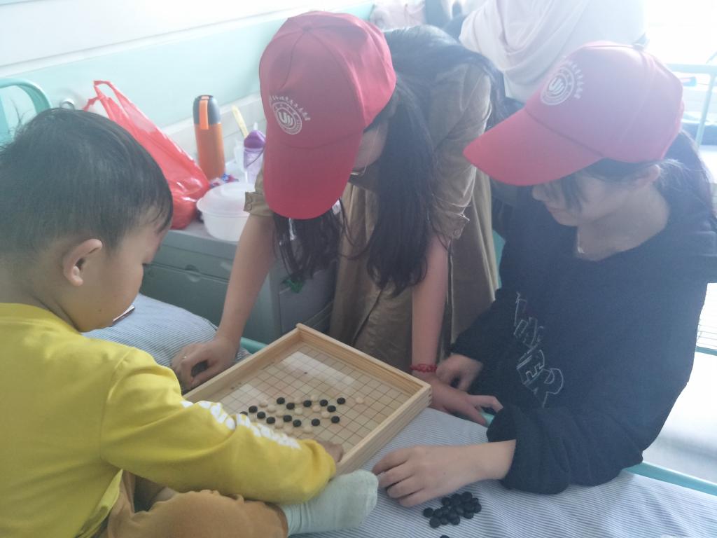 12:50,招募的志愿者在南大门校门口集合,一起乘40路公交车,经过四十分钟的路程,终于到达了附二医。乘坐电梯到八楼,分发给每个志愿者小红帽,并将其进行两两分组,在和护士进行了交谈之后,就去询问小朋友的意愿。经过他们的同意之后,第一组陪着两个小女孩在用彩铅画着秘密花园,第二组陪着一个小男孩玩五子棋和飞行棋,第三组同样也在画画。活动过程中,志愿者们和小孩子边聊天边玩耍,一段时间后,他们互换东西再继续和孩子们玩。一下午的时间就这样悄然流逝了,16:20,在医院合影留念,之后便踏上了回校的路程,一个繁忙又充实的下午就这样过去。