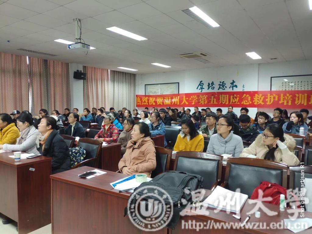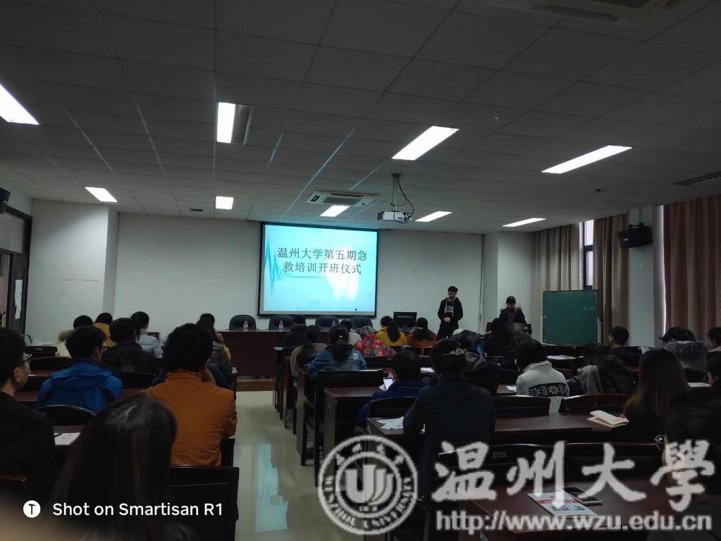 2018年12月8日上午,我校第五期应急救护培训班在南校区10B202会议室顺利开班,此次培训班共招收来自瓯江学院户外协会和bat365官网登录入口生命教育协会的成员42名。温州市红十字会资深讲师金晓胜、张豪对参加本期培训的60余名学员进行了为期两天的急救知识讲解和急救技能操作培训。