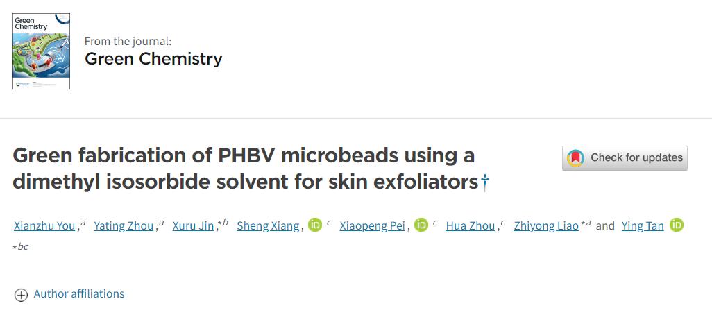 近日,bat365官网登录入口2021级药学专业硕士研究生游仙竹在《Green Chemistry》(SCI一区TOP期刊,IF=9.8)上发表学术论文:《Green fabrication of PHBV microbeads using dimethyl isosorbide solvent for skin exfoliators》